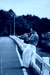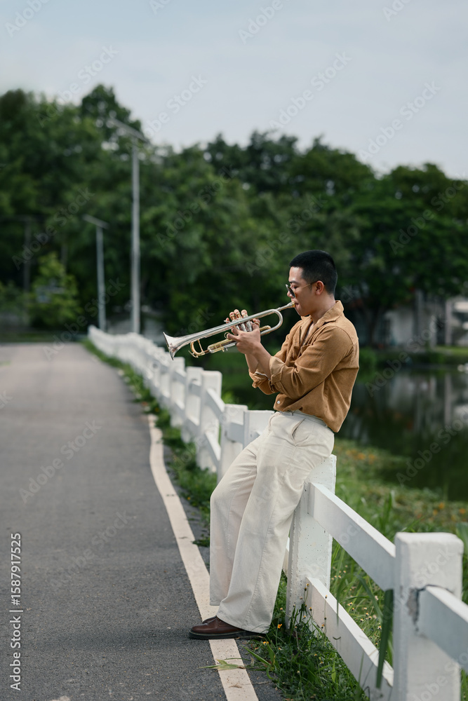 Man playing trumpet while leaning on a white fence along a quiet lakeside road