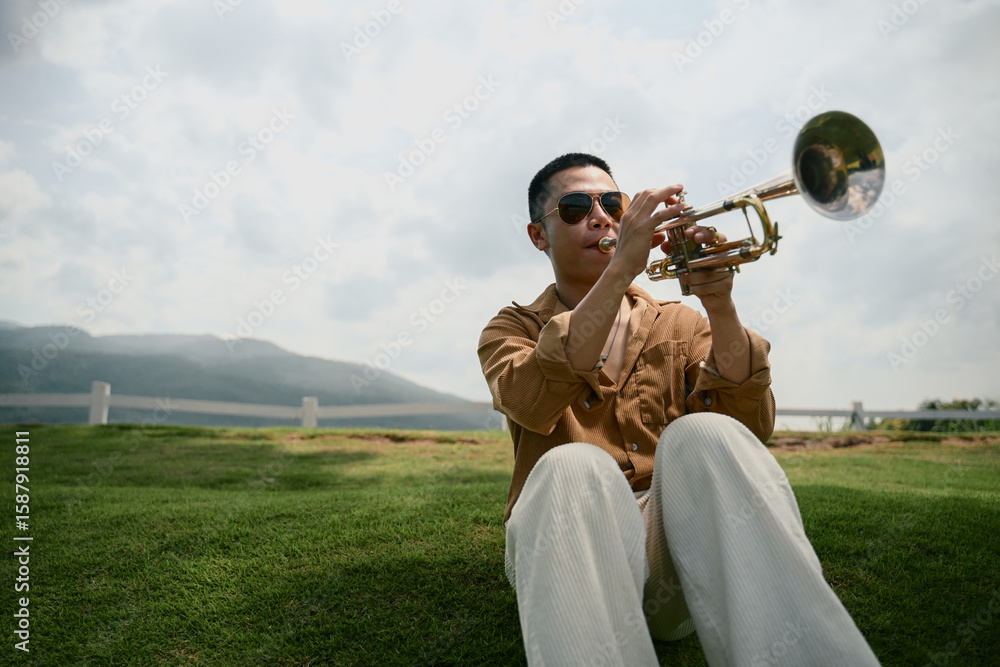 Man in sunglasses playing trumpet sitting on green grass with scenic mountain backdrop