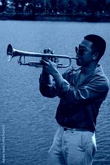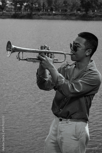 Portrait of trumpet player outdoors with calm lake as the background in monochrome style