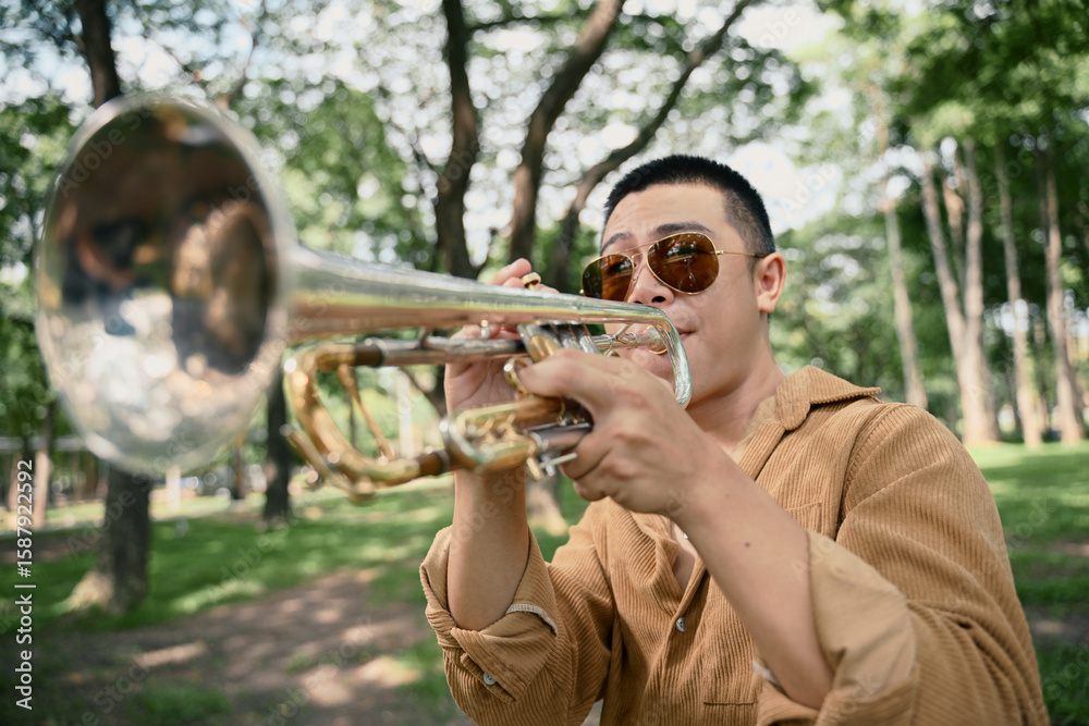 Dynamic close up of trumpet player in sunglasses performing outdoors in a sunny green park