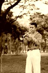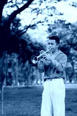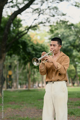 Young man playing the trumpet outdoors in a lush green park