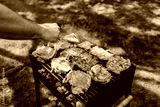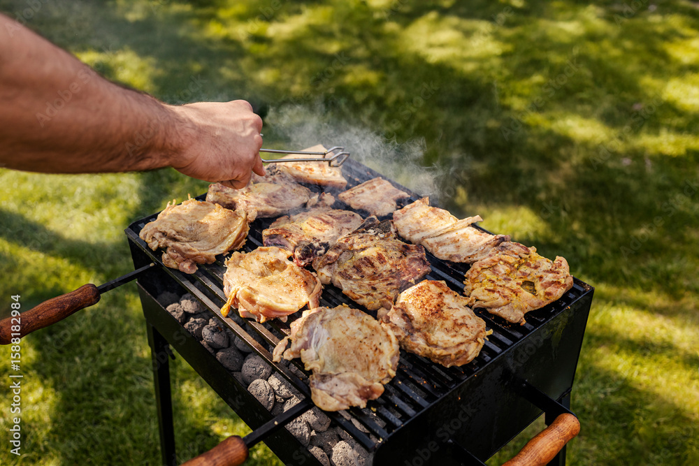 Close up of a hand grilling delicious meat on a grill in backyard.