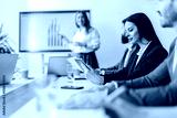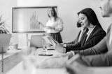 Selective focus on businesswoman with tablet following seminar at boardroom.