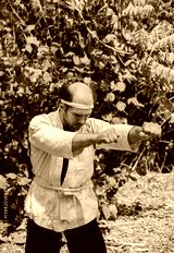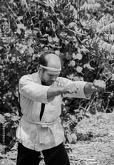 Man in martial arts gi and headband practicing outdoors. Focused stance with fists forward, surrounded by green foliage. Dynamic martial arts training or demonstration.