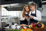 young chef cooking some food and checking recipe on tablet in the kitchen