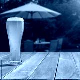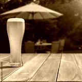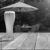 Glass of beer on wooden garden table – backyard relaxation at home. In the blurred background, a lush green garden and barbecue grill and patio area with outdoor furniture behind a house.