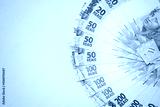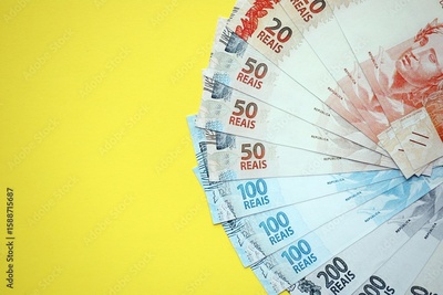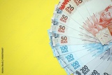 Close up of brazilian reais money bills in big amount on yellow. Pile of Brazil real currency