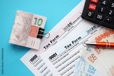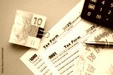 Brazilian reais banknotes and medicine pills. Brazil real money and tax blank close up