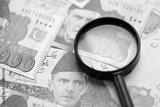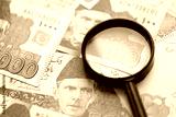 Pakistan rupees banknotes and magnifying glass. The current Pakistan money bills with loupe