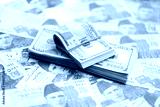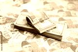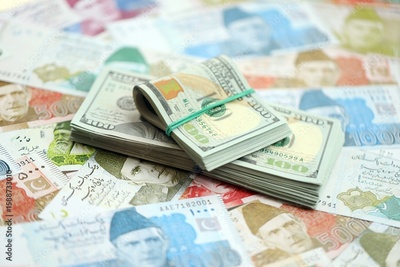 Bunch of US dollar bills lies on big amount of Pakistan rupees banknotes close up