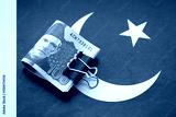 Pakistan rupees banknotes on Pakistani flag. The current Pakistan money bills