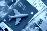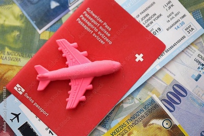 Swiss franc banknotes and passport with tickets. The current francs money bills and biometrical pass
