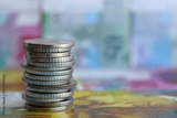 Swiss franc banknotes and coins. The current francs money bills and coins lies in big amount