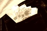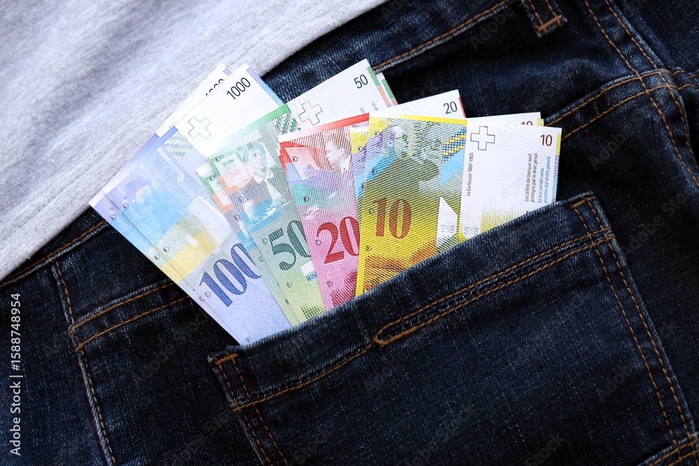 Swiss franc banknotes in denims pocket. The current francs money bills lies in jeans pocket