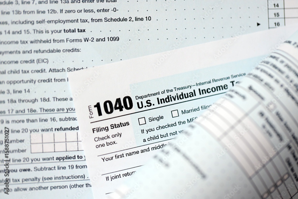 1040 US individual income tax return form blank close up. Few pages of united states tax blank