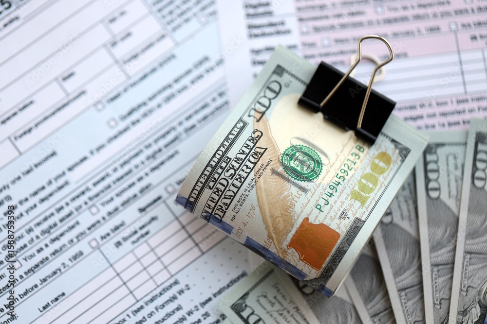Big amount of United States USD dollar bills on table with 1040 tax return form