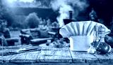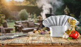 Chef hat and grilling tools on wooden table in backyard – outdoor cooking and barbecue concept with product space