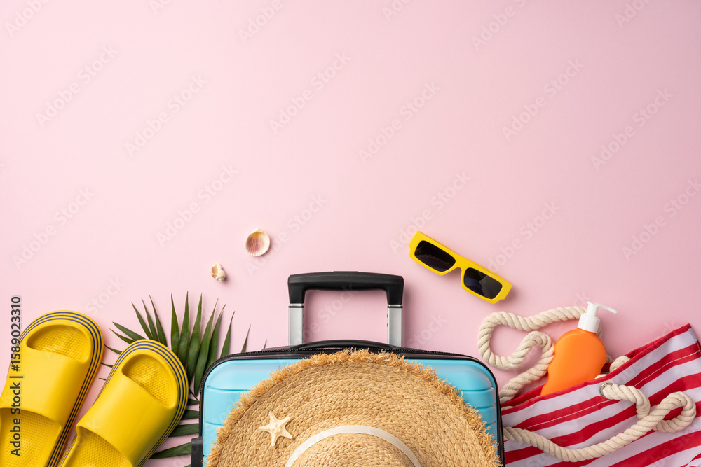 Flat lay travel elements including a suitcase, sunglasses, hat, and sunscreen on a colorful surface, ideal for summer vacation concepts