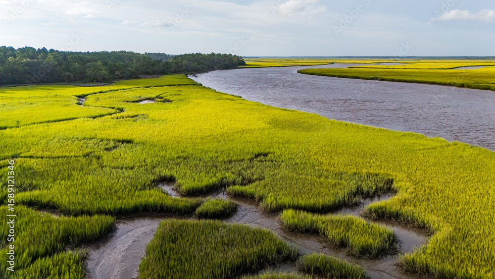 Scenic view of marshlands with winding waterways under clear skies during daylight hours