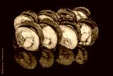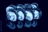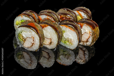 Sushi rolls with chicken, cream cheese, avocado, and vegetables wrapped in seaweed and drizzled with dark sauce are beautifully arranged on a reflective black surface