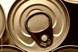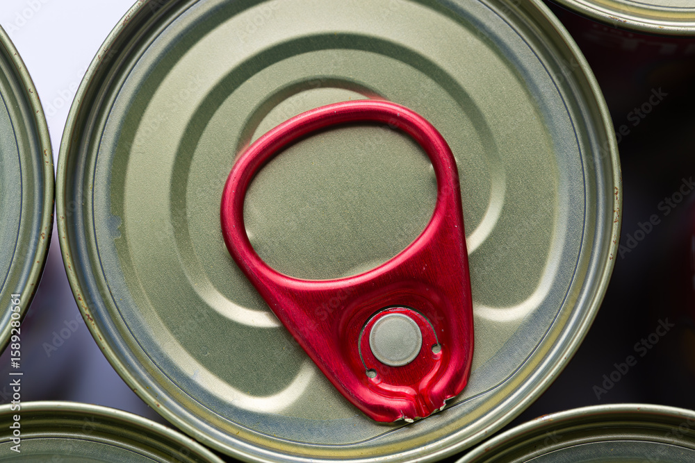 Close-up view of the top of a canned food lid,Tin silver cans for tinned food on wooden background,Macro canned food lid