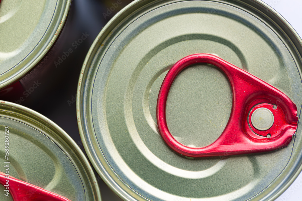 Close-up view of the top of a canned food lid,Tin silver cans for tinned food on wooden background,Macro canned food lid