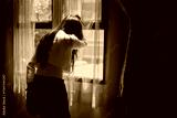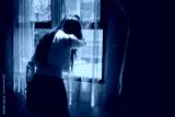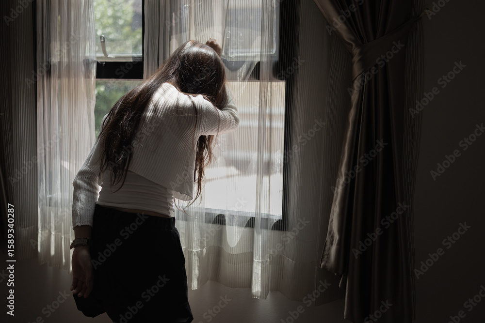 Sad and depressed young asian woman standing at window in the bedroom, Woman worry, Unhappy girl.