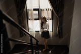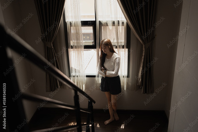 Sad and depressed young asian woman standing at window in the bedroom, Woman worry, Unhappy girl.