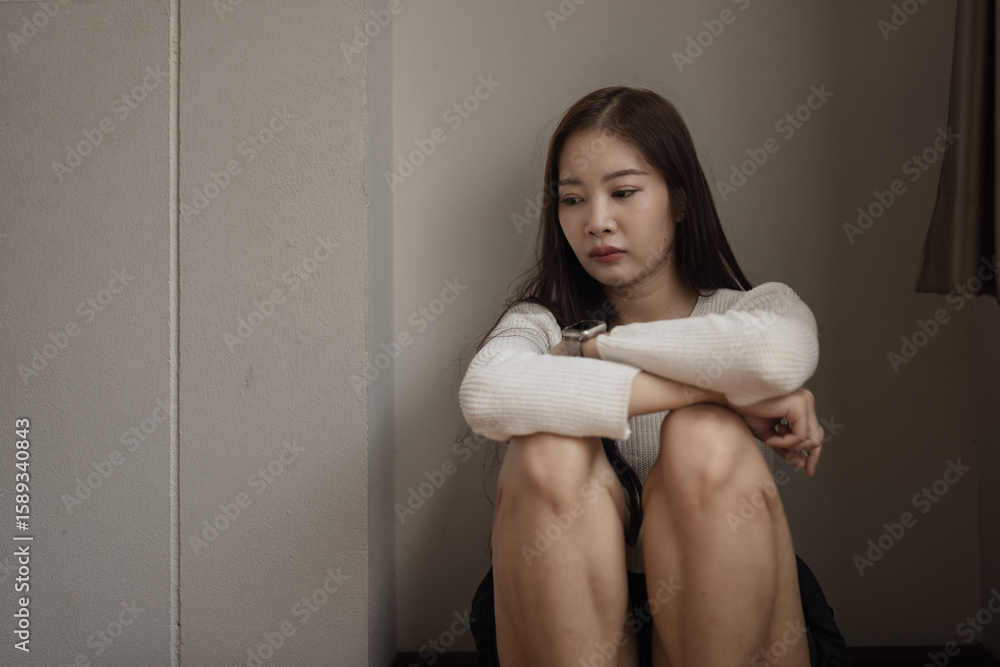 Sad and depressed young asian woman sitting at window in the bedroom, Woman worry, Unhappy girl.