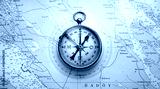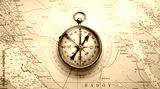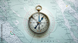 Magnetic old compass on old map. Travel, geography, history, navigation, tourism and exploration concept background. Retro compass on geography map.