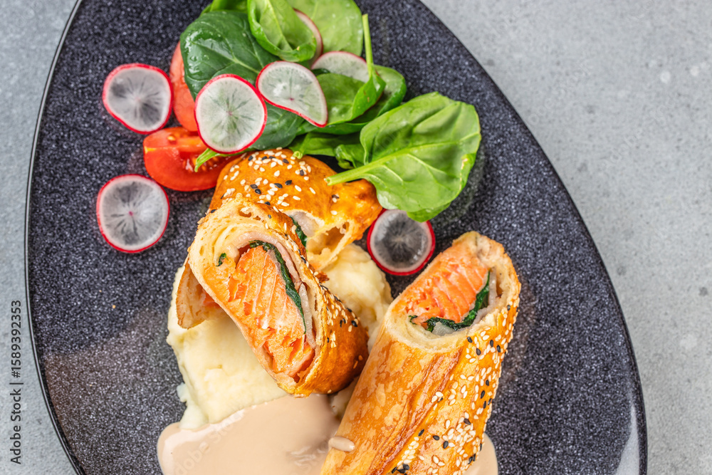 Golden salmon Wellington with a flaky sesame crust, served over creamy mashed potatoes with a light sauce, accompanied by fresh spinach, tomato, and radish salad