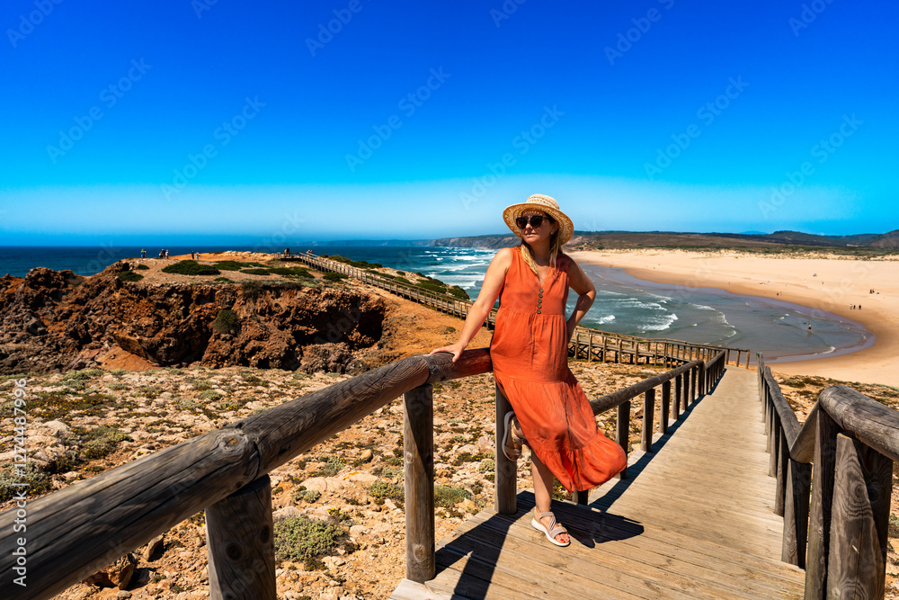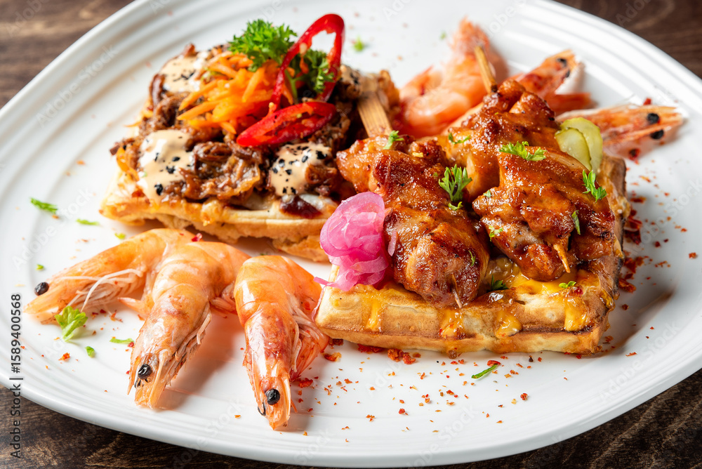 Gourmet dish with waffles, pulled pork, grilled shrimp, spicy sauce, pickled vegetables, and herbs, beautifully plated for upscale dining and food presentation.