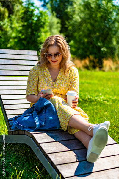 Portrait of beautiful mature woman sitting on park bench using mobile phone holding takeaway coffee in city park on sunny summer day