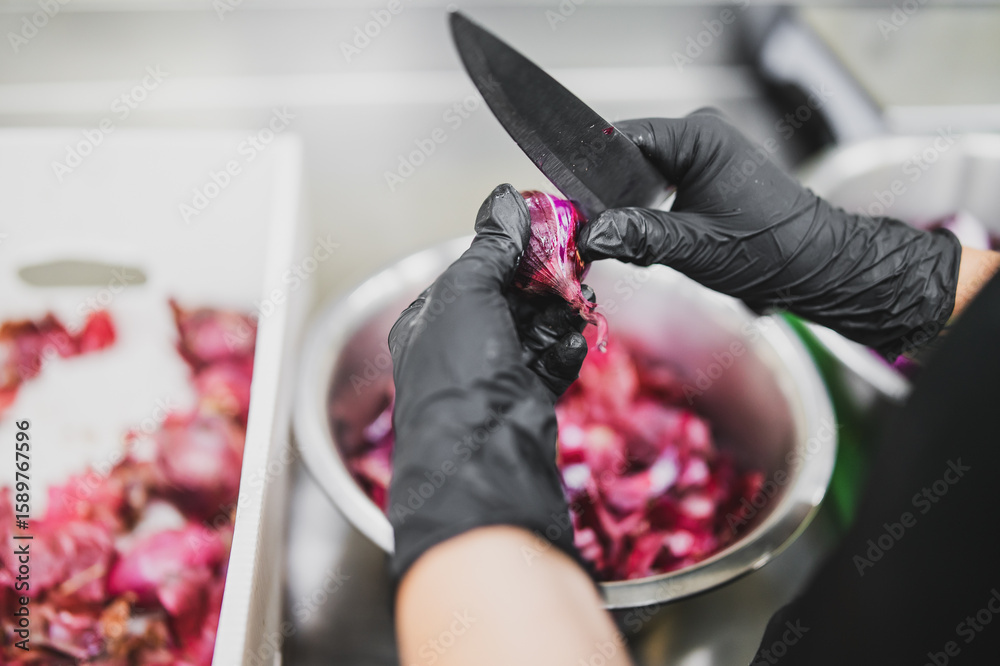 Close-up of hands in black gloves peeling a red onion with a knife over a bowl in a kitchen, showing food preparation and hygiene.