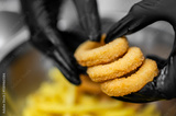 Close-up of gloved hands holding three crispy onion rings above a bowl of French fries. Concept of fast food, snack preparation, texture and contrast in food photography.