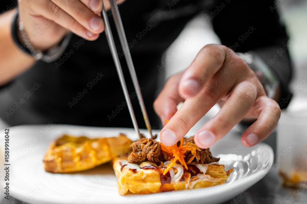 Close-up of hands using chopsticks to top a cheesy waffle with shredded meat and carrot, showcasing fusion cuisine and creative food styling.