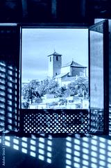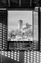 Ornate window in Dar al-Horra casting intricate shadows, framing a quiet Albayzin church