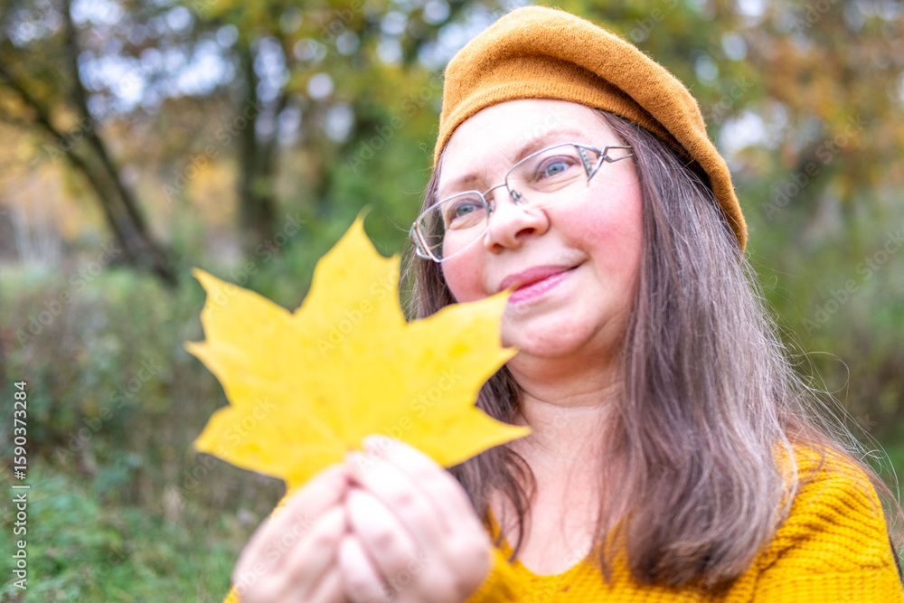 Happy middle-aged woman with autumn yellow leaf celebrating nature, fall season, enjoying fresh air, outdoor portrait, positive energy, nature background
