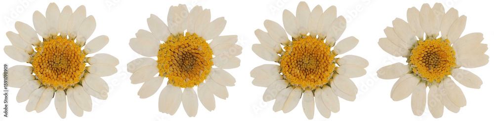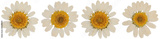 Close-up of a collection of dried, pressed daisy flowers with white petals