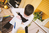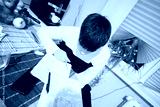 Overhead shot of a young person studying maps and papers at a table, pointing with a pencil. Surrounded by books, pencils, and other items. Learning and education theme.
