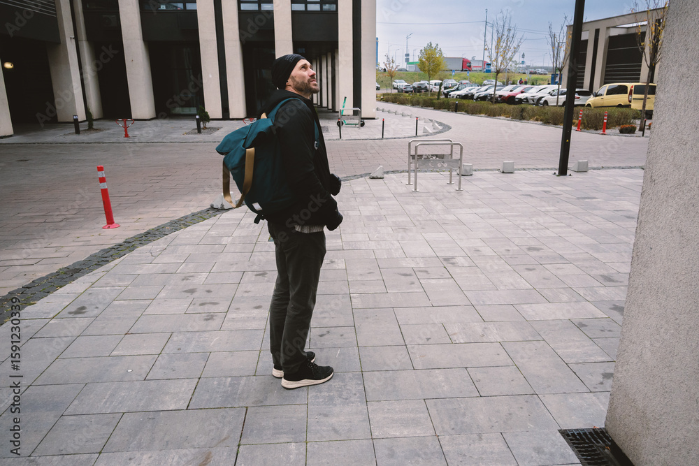 Man with backpack looking up at modern urban buildings on a tiled street. Captures themes of travel, exploration, and contemplation in a contemporary cityscape.