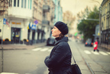 A thoughtful woman in a black beret stands on a city street, looking upward. Blurred urban background with warm bokeh lights. Urban lifestyle portrait.