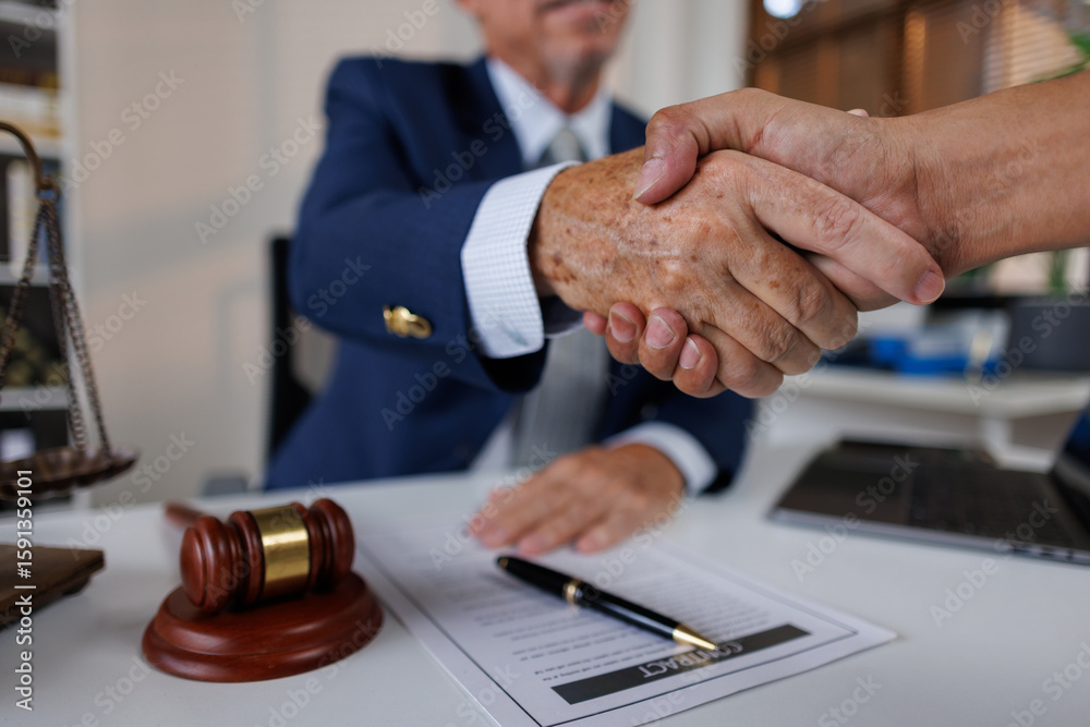 Happy mid aged business lawyer man manager handshaking greeting client in office. Smiling female executive making successful deal with partner shaking hand at work standing at meeting table.