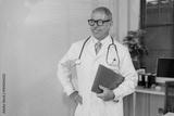 Portrait of handsome male doctor with stethoscope over neck working while looking at camera in the medical consultation.