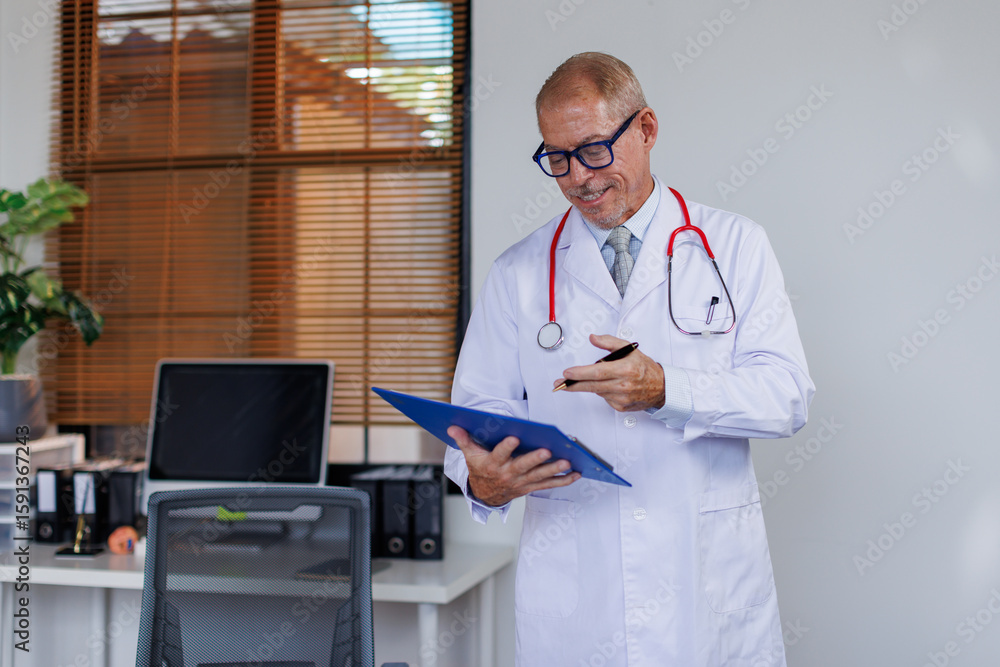 healthcare, Mala doctor character holds clipboard and standing in workplace.Professional consultation. Medical concept