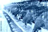 Hen, Chicken eggs and chickens eating food in farm