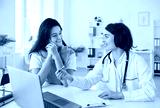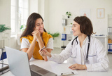 Happy doctor or nurse conducting a conversation with a cheerful patient in a clinic office, using a laptop for medical consultation and treatment planning to provide effective healthcare.