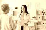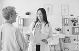 Female doctor in white lab coat smiling and shaking hands with older female patient in bright office. Cheerful cardiologist holding clipboard, engaging in friendly conversation during consultation.