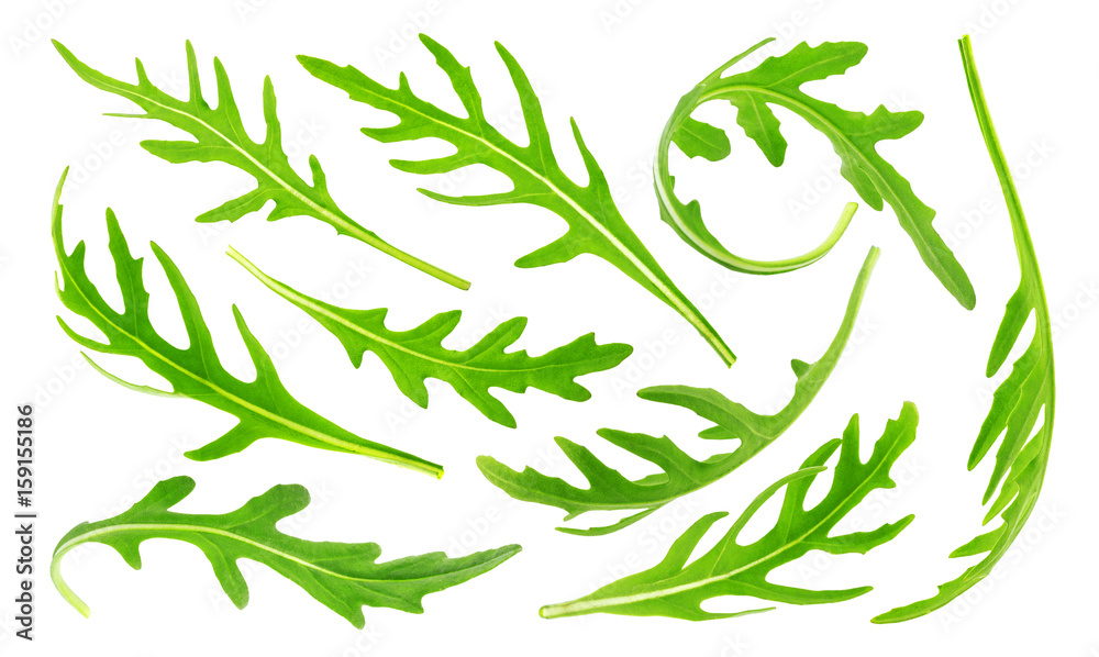 Rucola isolated on white background, collection. Green leaves arugula set, big collection