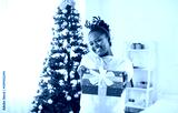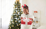 Merry Christmas and Happy New Year holiday african american woman presenting new year gift box glad to celebrate x-mas during winter season near nice fur tree light decoration, wearing reindeer horns